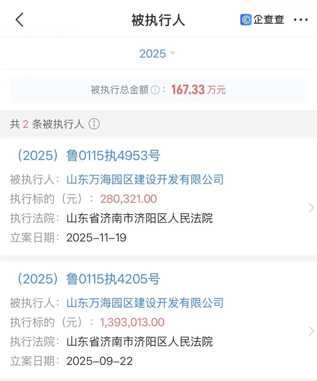 濟(jì)南中萬(wàn)置業(yè)有限公司成立于2020年10月,注冊(cè)資本5000萬(wàn)元,其股權(quán)結(jié)構(gòu)與萬(wàn)中置業(yè)完全相同。今年2月,該公司被濟(jì)南市市中區(qū)人民法院列為被執(zhí)行人,執(zhí)行標(biāo)的達(dá)87.16萬(wàn)元。
