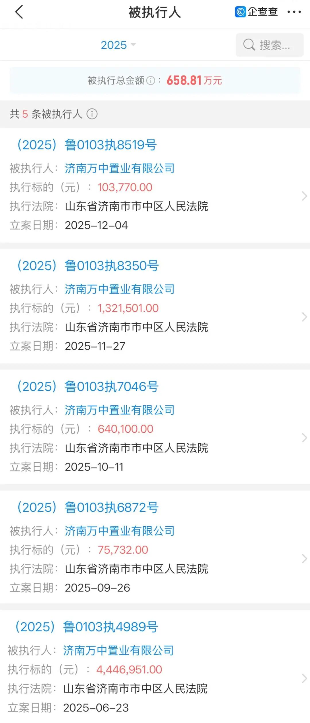 近期,濟(jì)南萬(wàn)中置業(yè)有限公司(以下簡(jiǎn)稱“萬(wàn)中置業(yè)”)因一筆10.38萬(wàn)元的執(zhí)行標(biāo)的再次被法院納入被執(zhí)行人名單。據(jù)統(tǒng)計(jì),該公司今年內(nèi)已累計(jì)被執(zhí)行5次,總金額高達(dá)658.81萬(wàn)元。作為一家有濟(jì)南市中區(qū)國(guó)企參股(持股比例30%)的房企,其法定代表人還關(guān)聯(lián)著19家公司,此次暴露的經(jīng)營(yíng)壓力只是冰山一角。