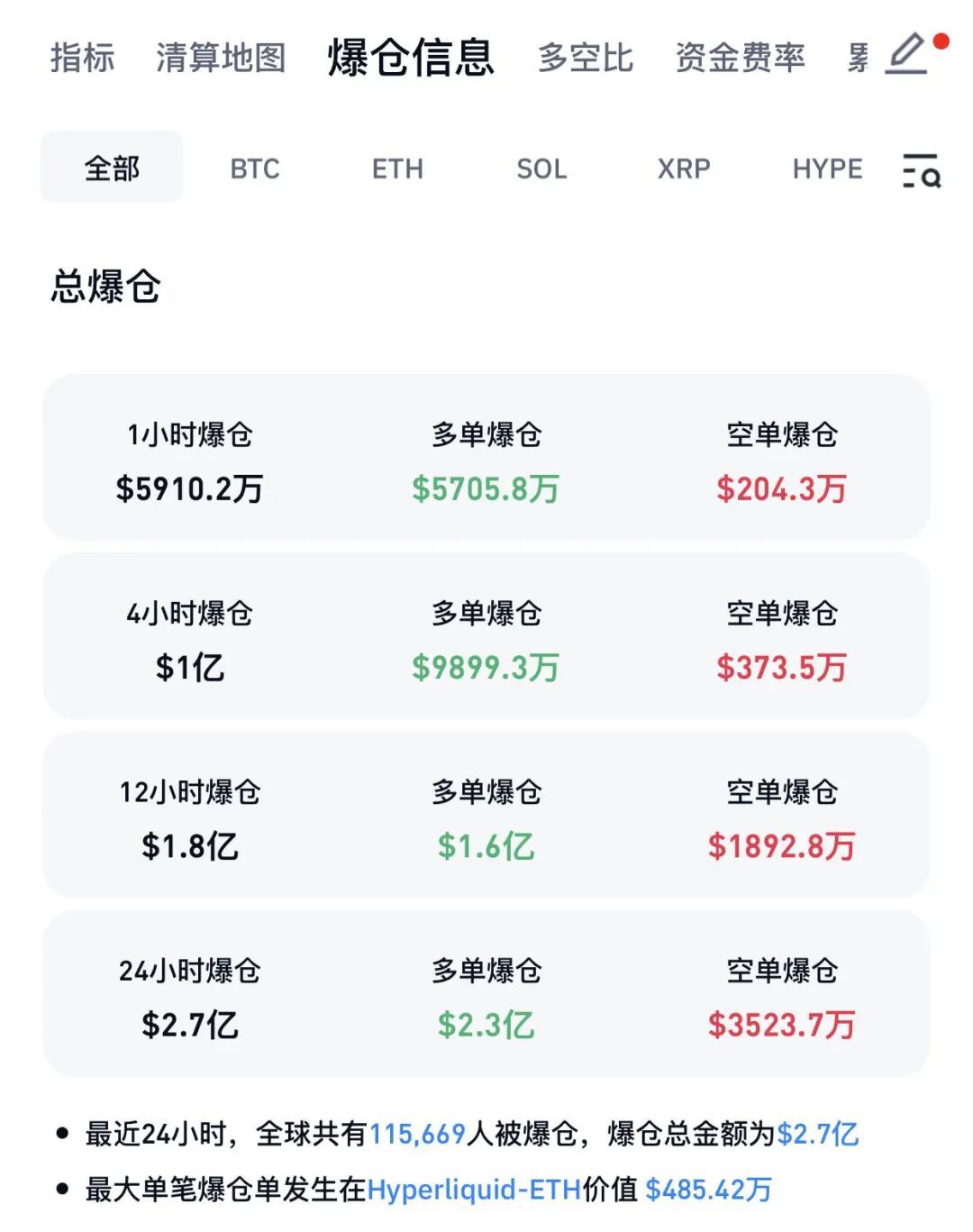 據(jù)Coinglass數(shù)據(jù)統(tǒng)計(jì),過去24小時(shí)內(nèi),加密貨幣全網(wǎng)合約爆倉金額達(dá)2.7億美元,爆倉人數(shù)高達(dá)11.57萬。其中多單爆倉金額為2.3億美元,空單爆倉金額3523.7萬美元。最大單筆爆倉出現(xiàn)在Hyperliquid-ETH交易品種,價(jià)值485.42萬美元。