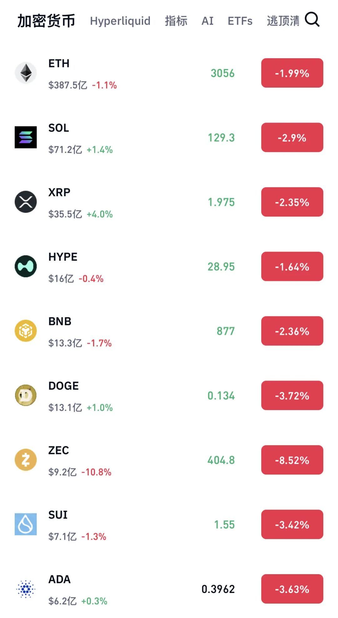 不僅比特幣,其他主流加密貨幣也紛紛下跌:以太坊跌幅1.99%,SOL幣下跌2.9%,XRP幣跌幅2.35%,狗狗幣下跌3.72%,ADA幣跌幅3.63%。