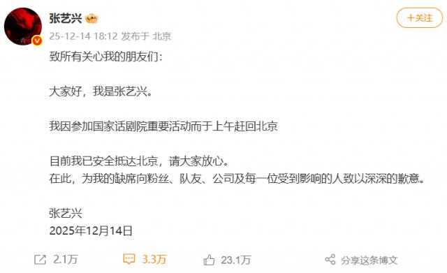12月14日下午,張藝興通過社交平臺發(fā)文回應此事:“我因需參加中國國家話劇院的重要活動,于今日上午緊急趕回北京,目前已安全抵達,請大家不必擔心。在此,我為此次缺席向粉絲、隊友、公司以及所有受到影響的人,致以最誠摯的歉意。”