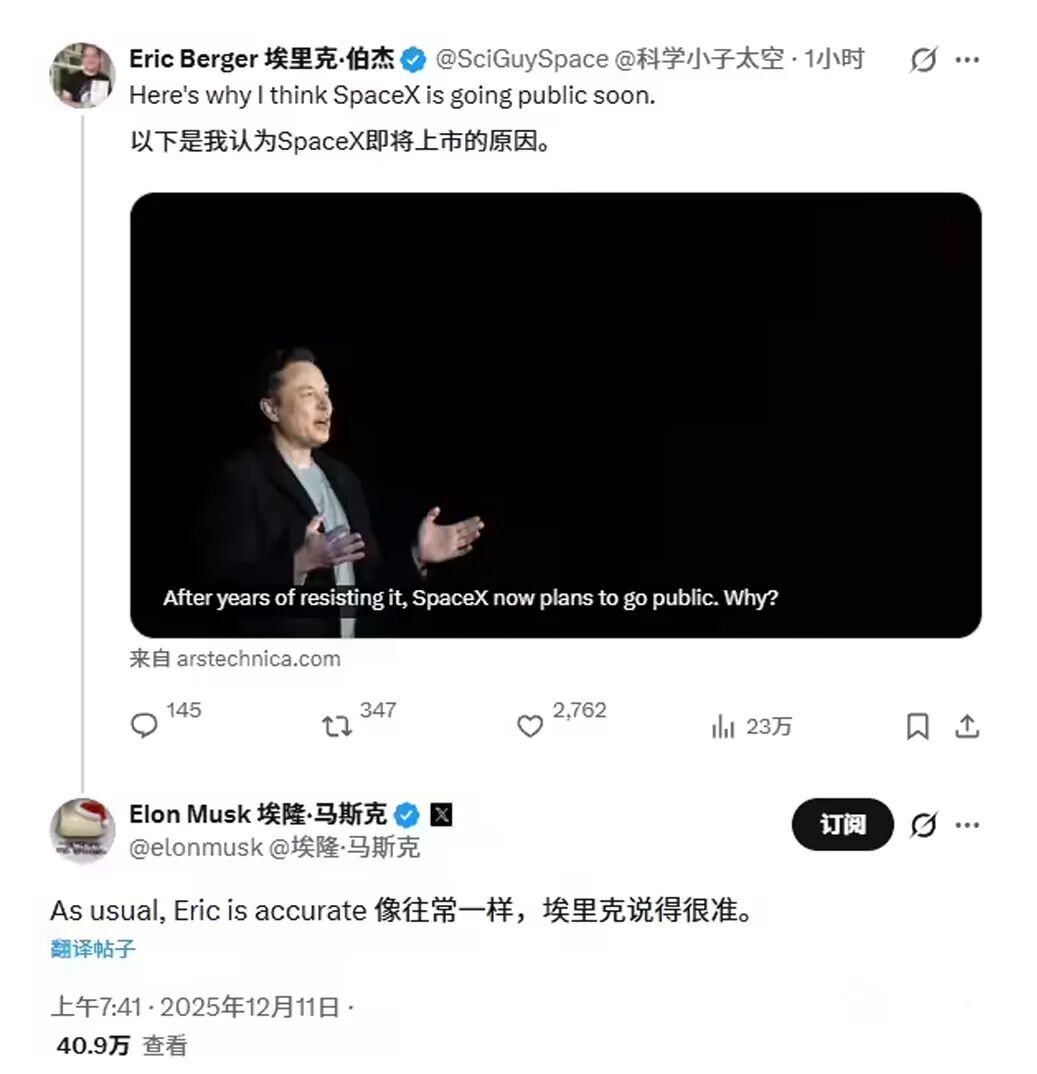12月11日,馬斯克在社交平臺X上點贊并認(rèn)可了資深太空作家埃里克·伯格關(guān)于SpaceX上市的文章,相當(dāng)于官方確認(rèn)了這一計劃。若SpaceX市值達(dá)1.5萬億美元,加上特斯拉獲批的高額薪酬方案,馬斯克的總財富將逼近9520億美元,有望成為全球首個萬億美元富豪。