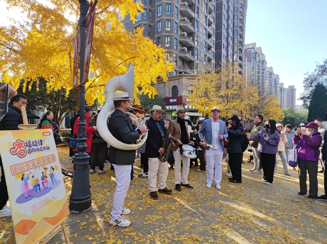 午后暖陽里,黃金城道步行街化作開放的藝術(shù)空間。各國銅管樂隊(duì)在銀杏樹下奏響歡快樂章,《甜蜜蜜》《夜上海》等熟悉旋律裹著銀杏香氣飄散開來。游客們隨節(jié)奏輕拍手,孩童伴音符嬉戲,金黃葉片在樂聲中旋轉(zhuǎn)飄落。