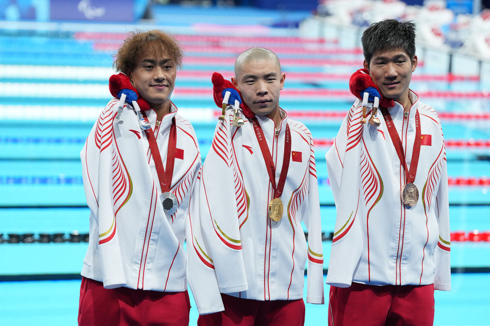 2024年9月6日,巴黎殘奧會游泳男子50米蝶泳S5級決賽中,中國選手郭金城(中)、袁偉譯(左)、王李超包攬冠亞季軍。新華社記者 熊琦 攝