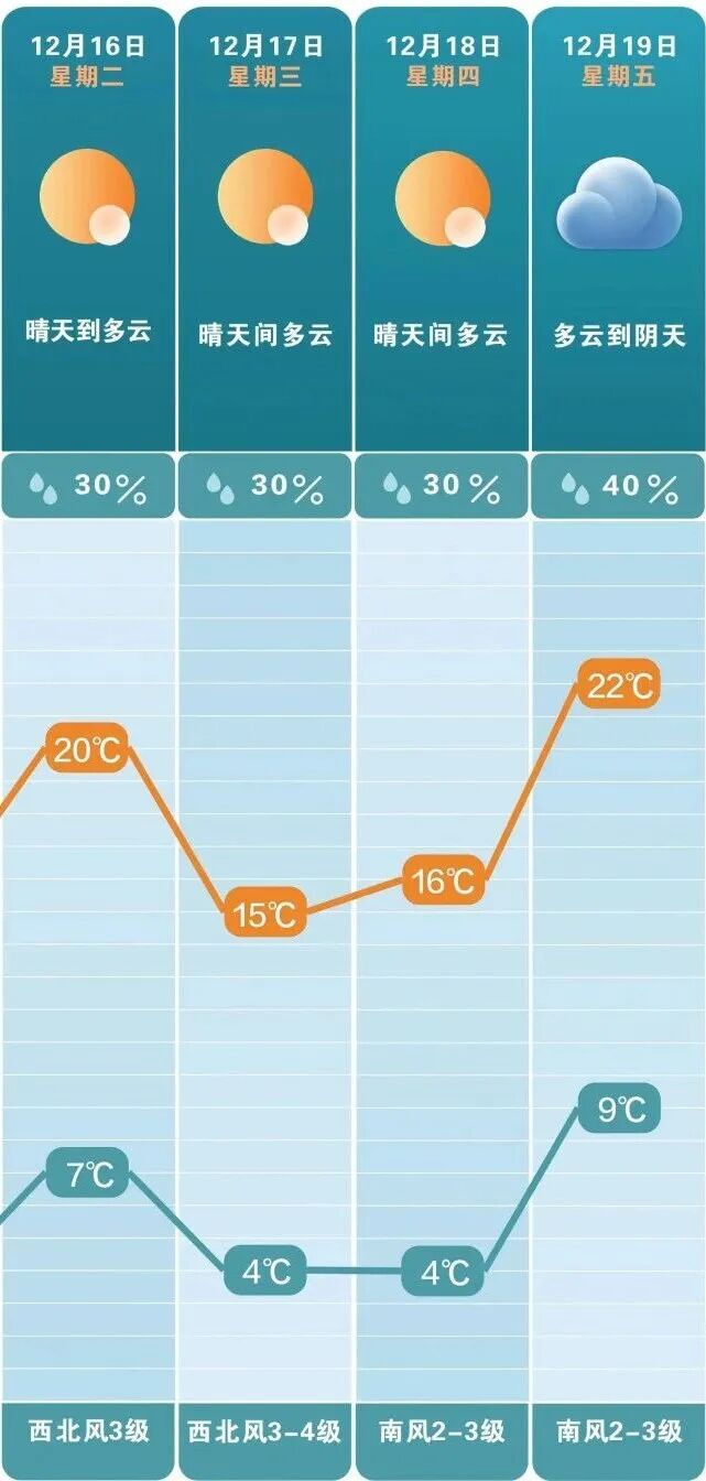 據(jù)氣象臺(tái)預(yù)測(cè),16日為晴天到多云,氣溫在7℃到20℃之間,西北風(fēng)3級(jí),晝夜溫差較大,早晚依舊偏涼,午后卻溫暖如春日。17日和18日都是晴天間多云,最低氣溫4℃,最高溫相比16日有所下降,分別是15℃和16℃。19日天氣轉(zhuǎn)為多云到陰天,但氣溫會(huì)大幅回升,最低溫升至9℃,最高溫比前一天上升6℃,達(dá)到22℃。