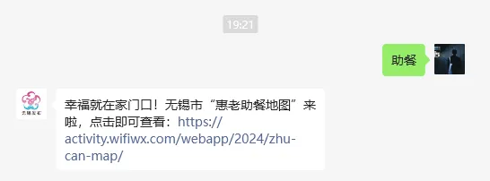 2. 在“無錫發(fā)布”微信公眾號(hào)對(duì)話框中,回復(fù)關(guān)鍵詞“食堂”“大食堂”“惠老助餐”或“助餐”,即可獲取無錫市“惠老助餐”地圖鏈接;