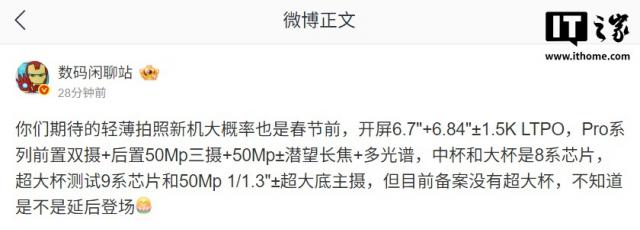 根據(jù)博主@數(shù)碼閑聊站之前的爆料,某品牌一款主打輕薄拍照的新機(jī)將采用6.7英寸和6.84英寸左右的1.5K LTPO屏幕。其中Pro版本配備前置雙攝,后置則為5000萬(wàn)像素三攝組合,還包含5000萬(wàn)像素左右的潛望式長(zhǎng)焦鏡頭以及多光譜傳感器;中杯和大杯機(jī)型搭載8系列芯片,超大杯版本則測(cè)試搭載9系列芯片,并配備5000萬(wàn)像素、1/1.3英寸左右的超大底主攝,這款新機(jī)預(yù)計(jì)就是華為nova 15系列。