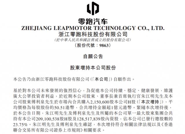 12月12日,朱江明與零跑汽車(chē)股東傅利泉在市場(chǎng)中共同購(gòu)入2150600股本公司H股(本次增持),每股平均價(jià)格約為50.51港幣,增持總金額超1億港元。據(jù)悉,這是自2024年8月起零跑管理層的第三輪大規(guī)模增持,14個(gè)月內(nèi)累計(jì)投入已達(dá)8.5億港元,用實(shí)際資金傳遞出管理層對(duì)公司發(fā)展的信心。