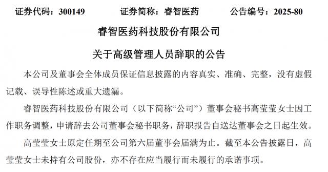 瑞財經(jīng) 嚴明會 近日,睿智醫(yī)藥 ( SZ300149 ) 發(fā)布了一則關于高級管理人員辭職的公告。