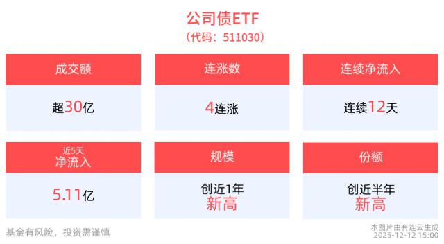 截至2025年12月12日15:00,公司債ETF(511030)當(dāng)日上漲0.02%,實(shí)現(xiàn)連續(xù)4個(gè)交易日上漲,最新單位凈值為106.61元。從年度表現(xiàn)來看,截至12月12日,該ETF今年以來累計(jì)漲幅達(dá)1.44%。