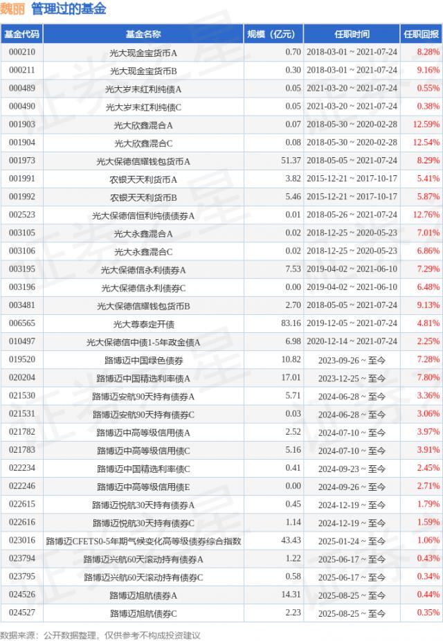 魏麗女士為中國國籍,2007年畢業(yè)于南京財經(jīng)大學應用數(shù)學系,獲得學士學位;2010年取得復旦大學統(tǒng)計學碩士學位。2010年9月至2013年7月,她在融通基金管理有限公司先后擔任交易員、研究員職務;2013年7月至2017年10月,于農(nóng)銀匯理基金管理有限公司歷任研究員、基金經(jīng)理助理及基金經(jīng)理。2017年10月,魏麗加入光大保德信基金管理有限公司,期間擔任多只基金的基金經(jīng)理,具體包括:2018年3月至2021年7月24日管理光大保德信現(xiàn)金寶貨幣市場基金;2018年5月至2021年7月24日擔任光大保德信耀錢包貨幣市場基金及光大保德信恒利純債債券型證券投資基金基金經(jīng)理;2018年12月至2020年5月23日管理光大保德信永鑫靈活配置混合型證券投資基金;曾任光大保德信永利純債債券型證券投資基金基金經(jīng)理;2019年12月5日至2021年7月24日擔任光大保德信尊泰三年定期開放債券型證券投資基金基金經(jīng)理;2018年5月30日至2020年2月28日管理光大保德信欣鑫靈活配置混合型證券投資基金;2021年3月20日至2021年7月24日擔任光大保德信歲末紅利純債債券型證券投資基金基金經(jīng)理;2020年12月14日至2021年7月24日管理光大保德信中債1-5年政策性金融債指數(shù)證券投資基金。此外,魏麗曾在匯添富基金管理股份有限公司擔任投資經(jīng)理。2022年8月,她加入路博邁,現(xiàn)任公募固收投資部總經(jīng)理,主要負責固定收益市場及投資策略的研究工作,跟蹤固定收益市場與相關產(chǎn)品的發(fā)展創(chuàng)新動態(tài),并協(xié)調(diào)路博邁整體投資策略及投資組合的構(gòu)建等事宜。2025年1月24日,魏麗開始擔任路博邁CFETS0-5年期氣候變化高等級債券綜合指數(shù)證券投資基金的基金經(jīng)理。