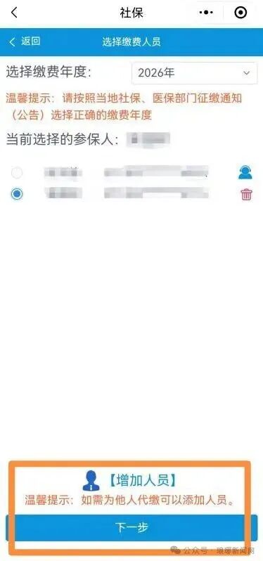 點擊“增加人員”,填寫需繳費人員姓名和身份證后點“下一步”(可幫他人繳費)。