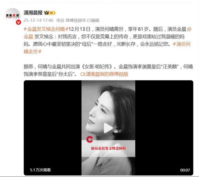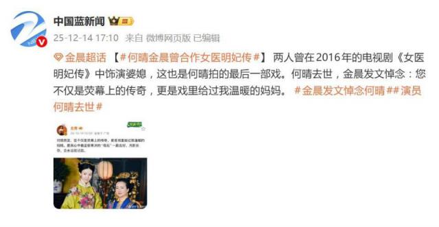 正因如此,金晨的緬懷才顯得如此真摯而沉痛。那不僅是后輩對前輩的崇敬,更像女兒對一位在艱難時刻仍給予她溫暖與力量的"母親"的深切懷念?!杜t(yī)明妃傳》成為何晴最后播出的作品,仿佛是她用生命完成的一次職業(yè)告別,詮釋了什么是"戲比天大"。