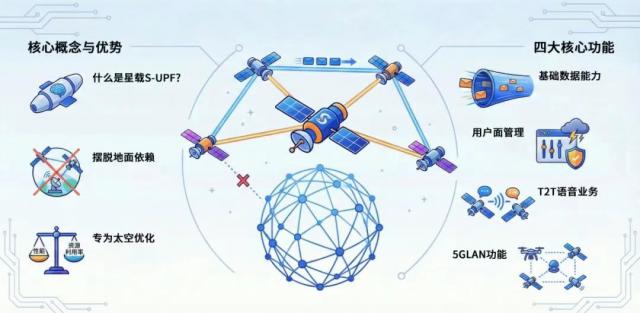 星載S-UPF是安裝在衛(wèi)星上的用戶數(shù)據(jù)處理網(wǎng)元,專門(mén)負(fù)責(zé)用戶數(shù)據(jù)轉(zhuǎn)發(fā)、通話接通、通信連接建立、通信安全保障等關(guān)鍵功能,同時(shí)深度融合衛(wèi)星間激光鏈路的優(yōu)勢(shì),支持專線業(yè)務(wù)、語(yǔ)音業(yè)務(wù)、局域網(wǎng)業(yè)務(wù)等通過(guò)激光鏈路實(shí)現(xiàn)星間直達(dá),徹底擺脫對(duì)地面核心網(wǎng)的依賴,為星地融合通信場(chǎng)景提供高效的用戶面功能支撐。