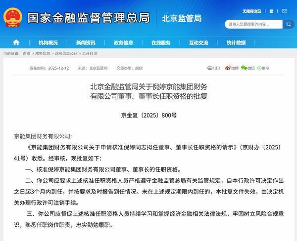 中國網(wǎng)財(cái)經(jīng)12月15日消息,北京金融監(jiān)管局近期發(fā)布批復(fù)公告,正式核準(zhǔn)倪婷擔(dān)任京能集團(tuán)財(cái)務(wù)有限公司(以下簡稱“京能財(cái)務(wù)公司”)董事及董事長職務(wù)的任職資格。具體批復(fù)內(nèi)容如下: