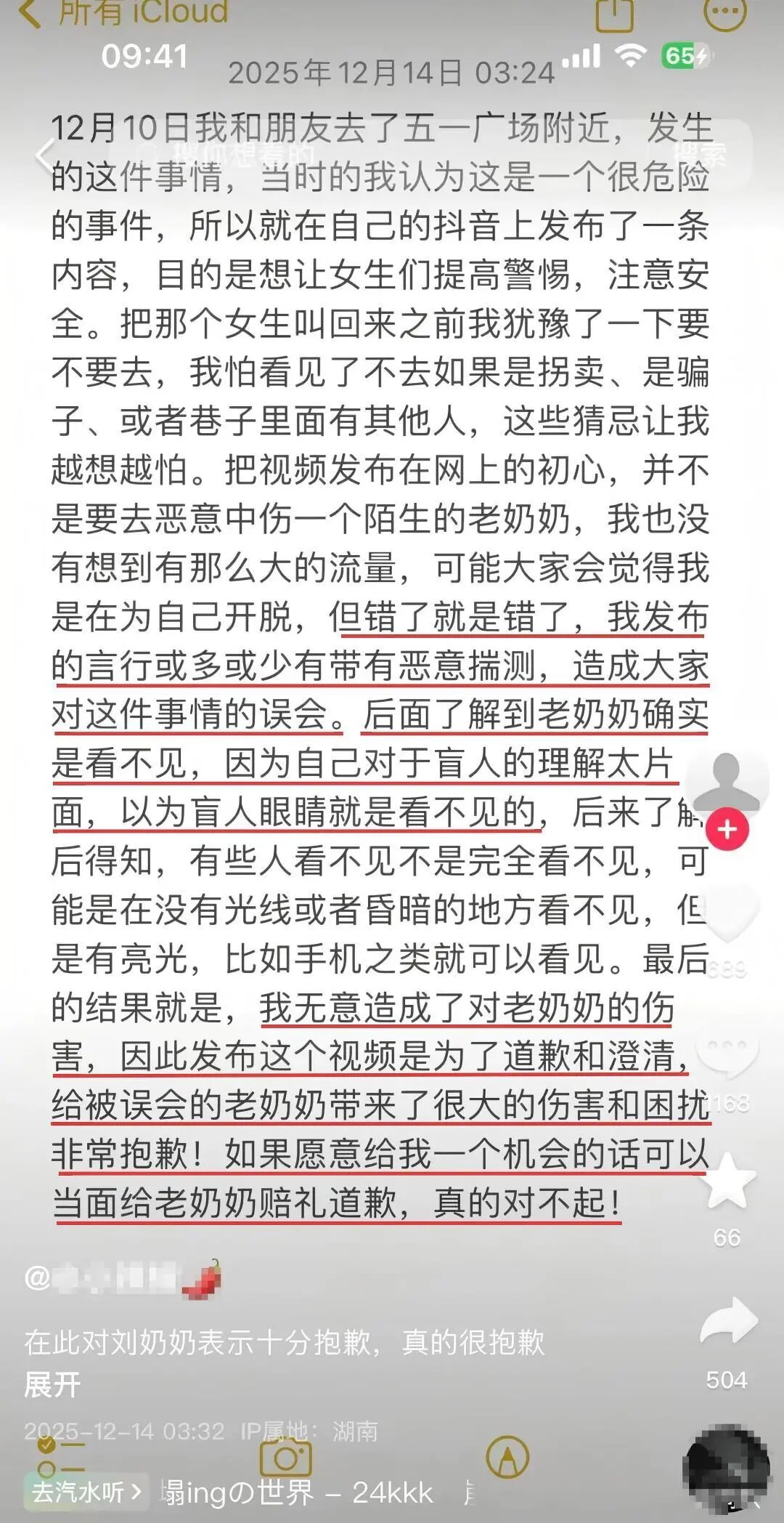 12月14日凌晨,原博主賬號發(fā)布道歉視頻,稱自己此前發(fā)布提醒的目的是想讓女性提高安全警惕,因發(fā)布的言行或多或少帶有惡意揣測,造成大家對這件事情的誤會。給劉奶奶帶來了傷害和困擾,對此深感抱歉,并愿意當(dāng)面賠禮道歉。