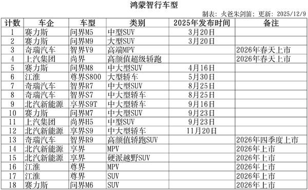 此外,鴻蒙智行現(xiàn)有車型如問界M9、問界M8、尊界S800、智界R7、享界S9和尚界H5等,2026年也有望推出年度改款或升級版本。