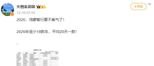【CNMO 科技消息】CNMO 獲悉,博主"火爸朱劍笛"近期整理的鴻蒙智行車型清單顯示,2026年該品牌將有不少于18款新車推向市場,覆蓋高端MPV、超級轎跑、轎跑SUV、硬派越野等多元品類。其中2款確定于2026年春季上市,1款計(jì)劃四季度推出,另有5款暫未明確具體季度但鎖定2026年上市。