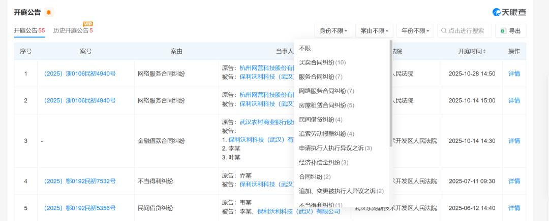 目前光是開庭公告就有55條,訴訟緣由涵蓋買賣合同、民間借貸、房屋租賃、金融借款等多種糾紛,起訴方名單幾乎覆蓋了從包材商、代工企業(yè)到電商服務商、檢測機構的整個行業(yè)鏈條。