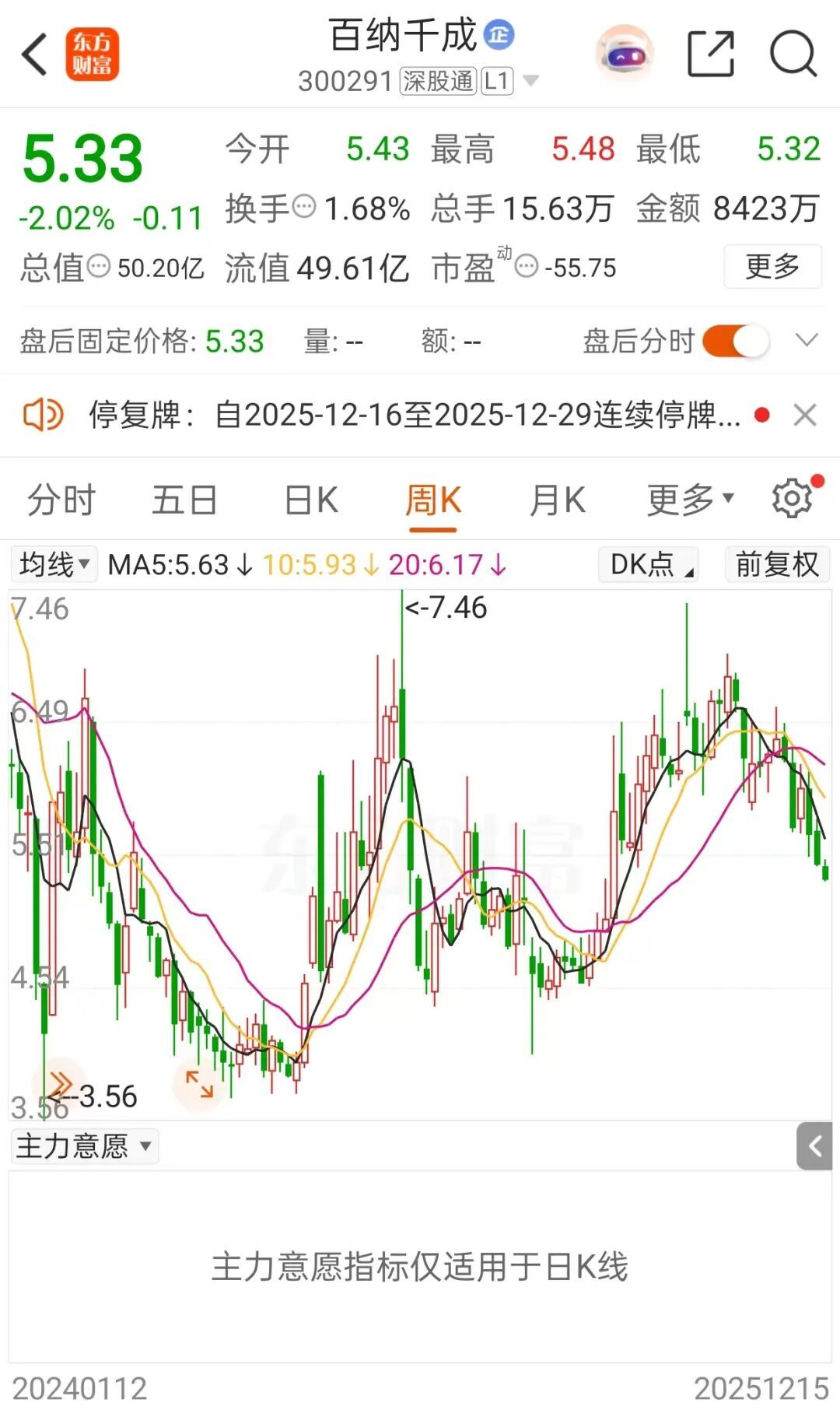 截至12月15日,百納千成股價(jià)報(bào)5.33元/股,總市值達(dá)50.20億元。