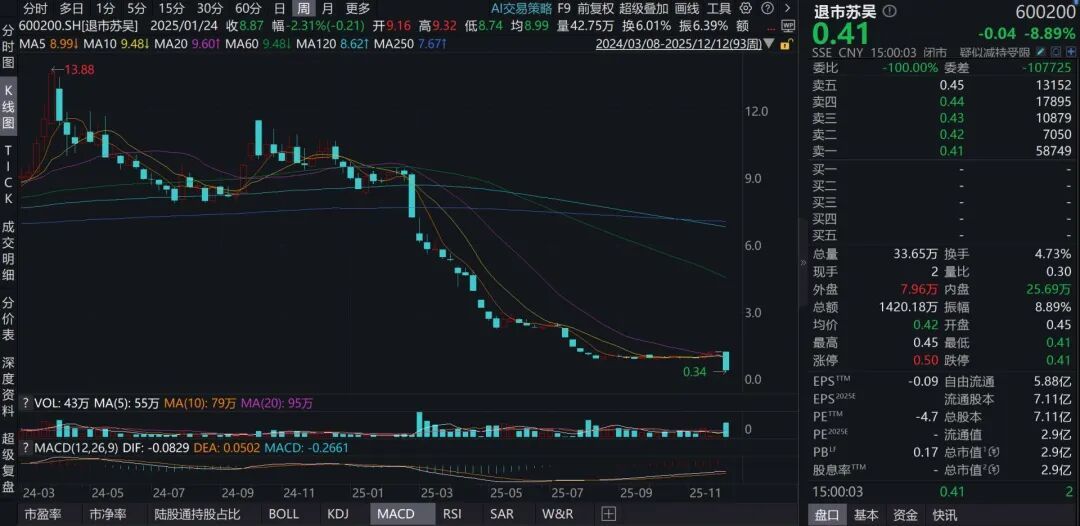 因連續(xù)多年財(cái)務(wù)造假被勒令退市的江蘇吳中股票,于2025年12月9日進(jìn)入退市整理期。截至發(fā)稿,中小股東決定去留的時(shí)間僅剩11個(gè)交易日。從12月9日開盤至今,其股價(jià)累計(jì)下跌66.94%。