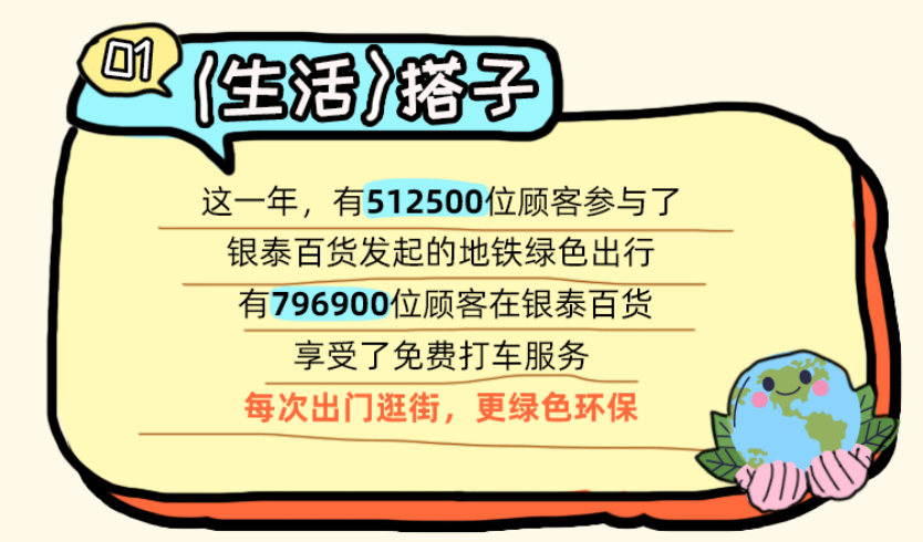 數(shù)據(jù)統(tǒng)計(jì)顯示,全年共有130多萬(wàn)位顧客參與銀泰百貨發(fā)起的地鐵綠色出行活動(dòng)或享受免費(fèi)打車(chē)服務(wù),讓每一次出行更綠色環(huán)保。