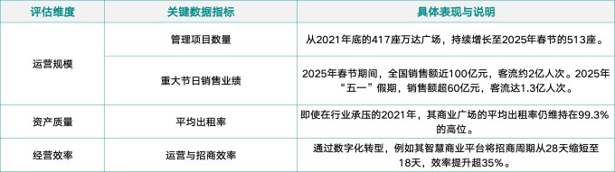 萬達商管的規(guī)?;\營展現(xiàn)出應(yīng)對周期變化的穩(wěn)定性,核心數(shù)據(jù)如下表所示,反映了規(guī)模的持續(xù)增長、資產(chǎn)質(zhì)量與經(jīng)營效率的穩(wěn)定。