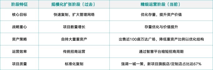 過去十年,萬達借助“輕資產(chǎn)”模式實現(xiàn)了快速擴張,讓“萬達廣場”品牌遍布全國。但隨著市場飽和與競爭加劇,單純追求數(shù)量增長的時代已經(jīng)過去。萬達正從“輕資產(chǎn)規(guī)?;瘮U張”階段轉(zhuǎn)向“輕資產(chǎn)精細運營”階段,工作重心也從“快速復制”轉(zhuǎn)為“存量優(yōu)化”與“價值提升”。