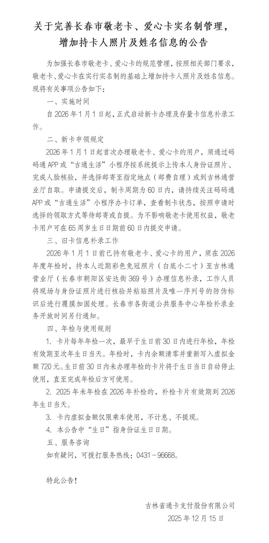 1. 自2026年1月1日起,長(zhǎng)春市敬老卡、愛(ài)心卡將新增持卡人照片與姓名信息,進(jìn)一步規(guī)范卡片使用。