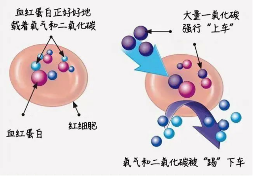 當(dāng)人們吸入一氧化碳后,它會和氧氣競爭結(jié)合血液中的血紅蛋白,使得氧氣無法正常與血紅蛋白結(jié)合,最終導(dǎo)致人體缺氧。