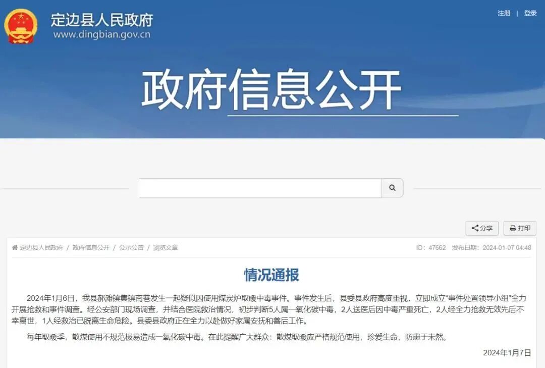 2024年1月6日,陜西榆林定邊縣發(fā)生了一起疑似因使用煤炭爐取暖導(dǎo)致的中毒事件。經(jīng)過初步判斷,有5人出現(xiàn)一氧化碳中毒癥狀,其中2人送醫(yī)后因中毒過重死亡,另外2人雖經(jīng)全力搶救仍不幸離世,僅1人經(jīng)過救治脫離了生命危險。