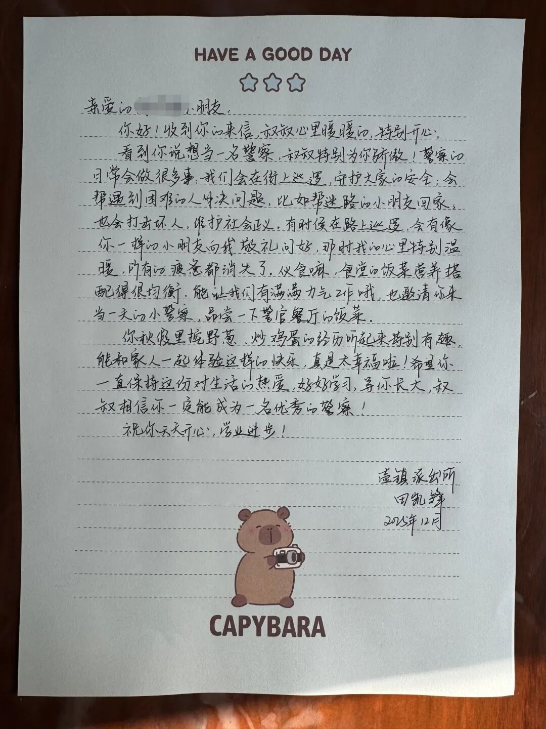 原標(biāo)題:《小學(xué)生給派出所副所長寫信“你的伙食豐盛嗎?”回信來了!》