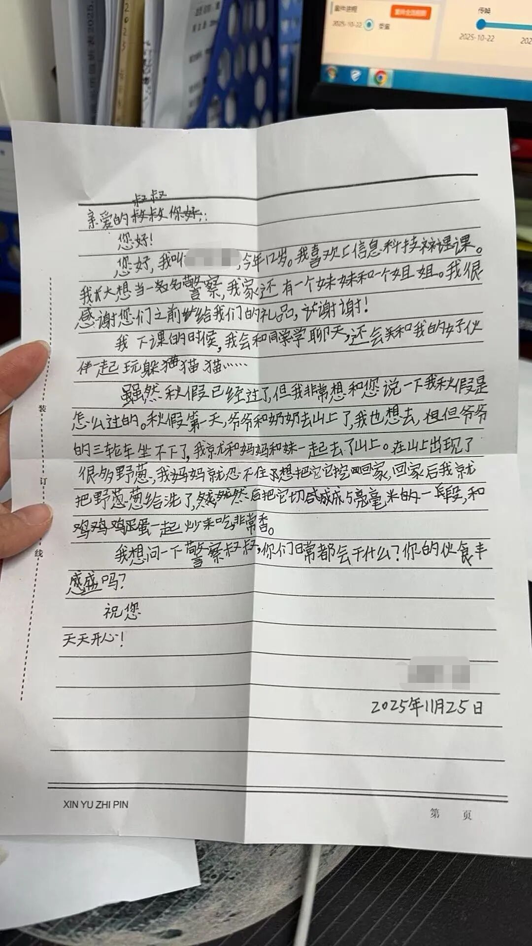 信中還寫道“我長大想當(dāng)一名警察!”。原來,寫信的是轄區(qū)內(nèi)一名小學(xué)生,他一直懷揣著警察夢想,對這個(gè)職業(yè)充滿憧憬與向往。小朋友在信里開心地分享自己的生活:“我有一個(gè)姐姐和妹妹,我們會(huì)一起上山摘野蔥,把野蔥和雞蛋一起炒……”在分享生活的同時(shí),他也惦記著守護(hù)平安的警察叔叔,樸素字句間滿是純真的關(guān)懷。