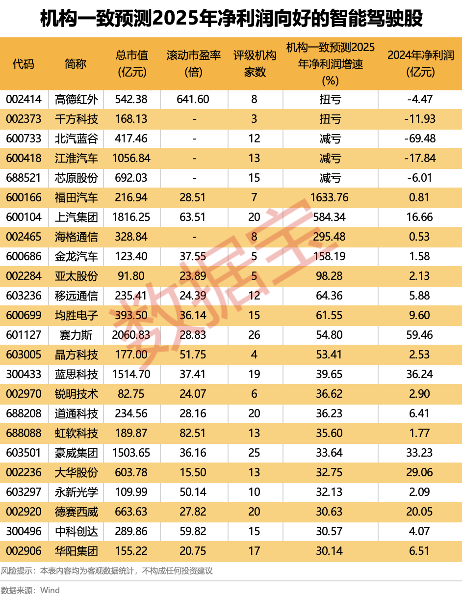 根據(jù)3家及以上機構(gòu)的一致預(yù)測,在2024年同期實現(xiàn)盈利的基礎(chǔ)上,2025年全年凈利潤增速有望超過30%的智能駕駛股共有19只。其中,福田汽車、上汽集團(tuán)、海格通信、金龍汽車的凈利潤增長翻倍,同比增速分別為1633.76%、584.34%、295.48%、158.19%。此外,高德紅外、千方科技等企業(yè)有望實現(xiàn)扭虧為盈。