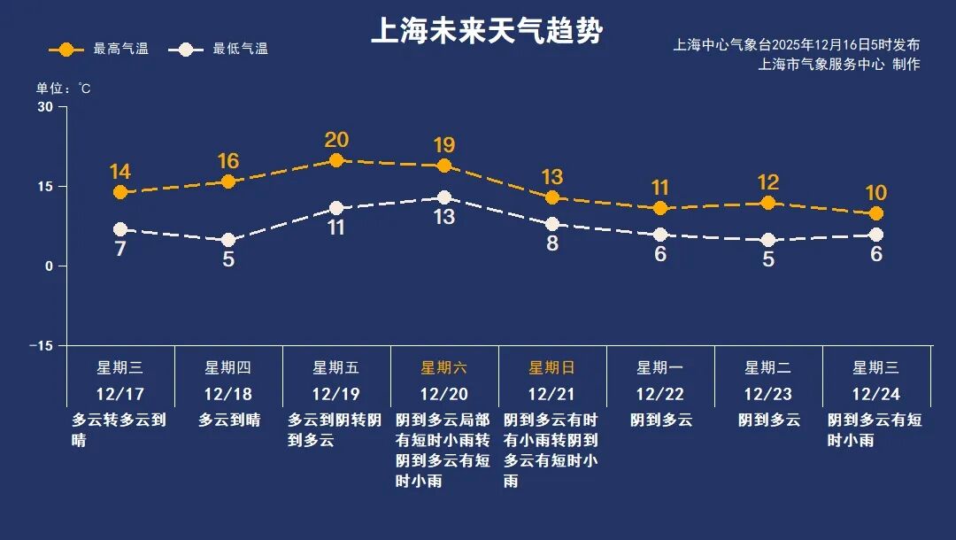 周三(12月17日)和周四(12月18日)受弱冷空氣擴散影響,氣溫略有下降,最高氣溫回落至14到16℃。周五(12月19日)氣溫將再度回升,有望突破20℃,屆時體感會較為溫暖。周日(12月21日)隨著新一股冷空氣抵達,氣溫將降至13℃左右。本周前期以多云天氣為主,陽光充足,需注意用火用電安全;周末受冷暖空氣交匯影響,云層增厚并伴有小雨,建議大家提前備好雨具。