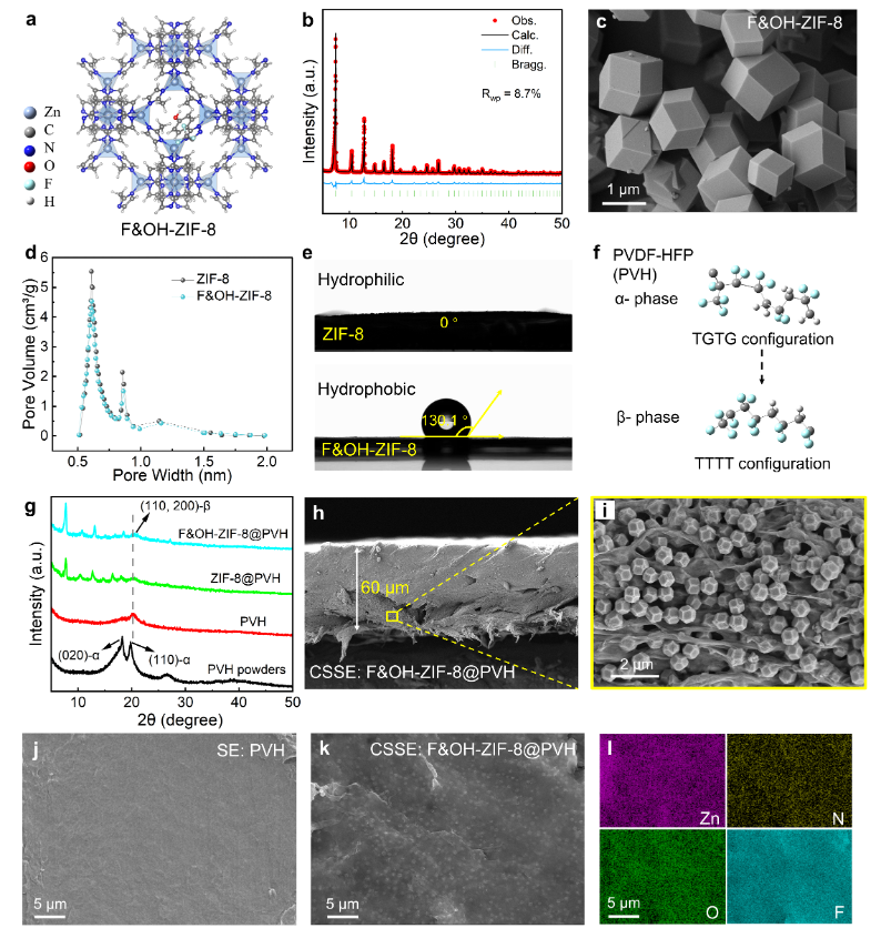 圖 2. a) F&OH-ZIF-8晶體結構理論模型圖;b) F&OH-ZIF-8的實驗與精修XRD譜圖;c) F&OH-ZIF-8粉末的SEM圖像;d) ZIF-8和F&OH-ZIF-8的孔徑分布曲線;e) ZIF-8和F&OH-ZIF-8的表面接觸角測試;f) PVH聚合物分子構型圖;g) PVH粉末及其復合電解質膜的XRD圖譜;h) F&OH-ZIF-8@PVH復合電解質膜截面SEM圖像;i) 高倍放大插圖;j) PVH電解質膜表面SEM圖像;k) F&OH-ZIF-8@PVH電解質膜表面SEM圖像;l) F&OH-ZIF-8@PVH電解質膜表面EDS元素分布圖。