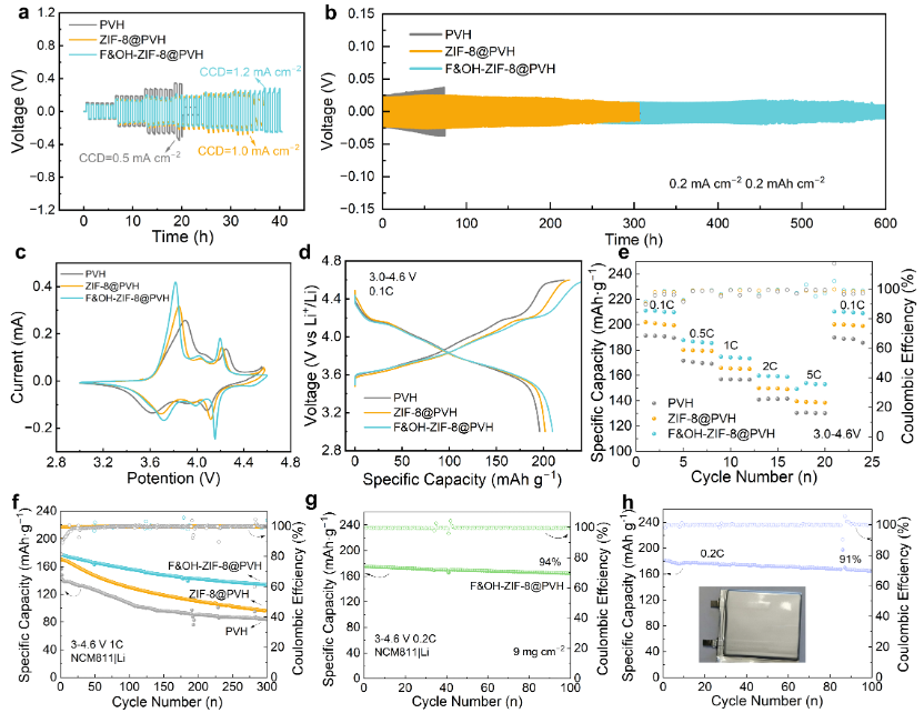 圖4. a) PVDF-HFP基復合固態(tài)電解質的臨界電流密度測試曲線;b) 鋰對稱電池的長循環(huán)穩(wěn)定性;c) 采用PVH、ZIF-8@PVH和F&OH-ZIF-8@PVH電解質的Li‖NCM811電池的循環(huán)伏安曲線;d) 電池在0.1C倍率下的首圈充放電曲線;e) 倍率性能測試;f) 2C高倍率下的長循環(huán)性能;g) 高負載條件下的1C循環(huán)性能;h) 軟包電池的循環(huán)穩(wěn)定性(電壓窗口:3.0 - 4.6 V)。