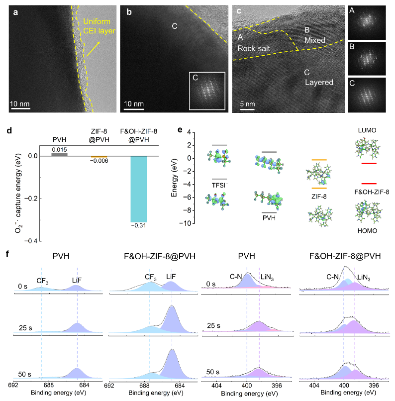 圖5. 高電壓循環(huán)下的界面穩(wěn)定性研究。a) F&OH-ZIF-8@PVH全電池循環(huán)20次后CEI的高分辨透射電鏡圖像;b, c) 循環(huán)20次后NCM811正極的微觀結構演變:b) F&OH-ZIF-8@PVH和 c) PVH全電池中NCM811正極的TEM和FFT圖像;d) DFT計算的PVDF-HFP基固態(tài)電解質與O??·的結合能;e) 分子的LUMO和HOMO能級值及相應的結構;f) 對稱電池在0.2 mA cm?2下循環(huán)20次后SEI的XPS深度剖析。