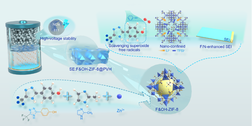 研究團隊將含氟和酚羥基的雙功能配體(F&OH-L)引入ZIF-8體系,制備出雙雜化MOF材料(F&OH-ZIF-8)。該材料保留ZIF-8高比表面積與規(guī)整孔道結構的同時,引入三種關鍵功能基團(見圖1),協(xié)同作用機制如下:(1) 自由基清除:酚羥基(Ar–OH)通過電子離域效應,有效清除高電壓下NCM811正極界面產(chǎn)生的超氧自由基(O??·),抑制鏈式氧化反應,這一效果經(jīng)EPR測試和DFT計算(吸附能-0.31 eV)證實;(2) 離子傳輸調節(jié):三唑基團與Zn2?形成的配位不飽和位點對TFSI?有特異性吸附(DFT計算結合能-2.45 eV),使Li?遷移數(shù)提升至0.68,Raman光譜和?Li NMR驗證了更多自由Li?的釋放與快速遷移;(3) 界面穩(wěn)定:強電負性的三氟甲基(–CF3)在電化學還原時優(yōu)先分解,誘導形成富含無機物(LiF含量65.8%,Li3N含量68.5%)的梯度結構固體電解質界面膜(SEI),有效抑制鋰枝晶生長。