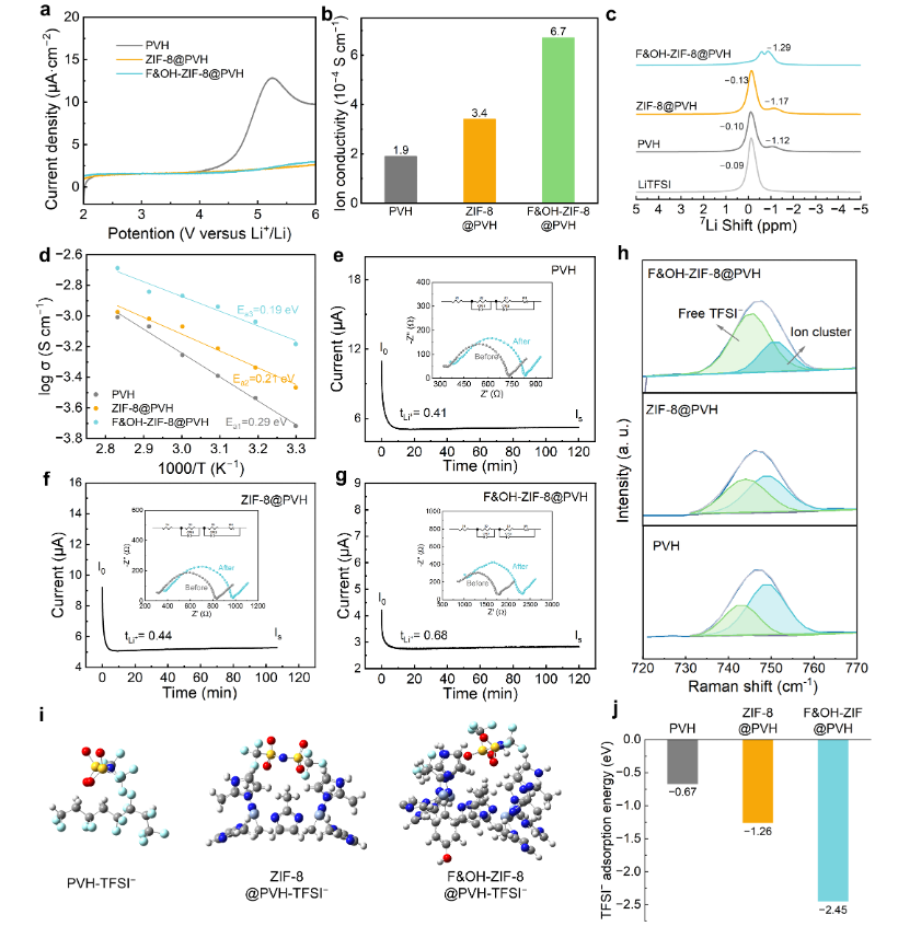 該復合固態(tài)電解質(F&OH-ZIF-8@PVH)綜合性能優(yōu)異(見圖3)。其離子電導率(6.7×10?? S·cm?1)較純PVH基質(1.9×10?? S·cm?1)提升252%。DFT計算和Raman光譜表明,F(xiàn)&OH-ZIF-8對TFSI?的強錨定作用(吸附能-2.45 eV)是Li?遷移數(shù)提升至0.68的關鍵。同時,MOF引入有效降低聚合物基體結晶度(從23.4%降至17.6%),為Li?傳輸提供更廣闊無定形區(qū)通道,顯著降低Li?遷移活化能(從0.29 eV降至0.19 eV)。