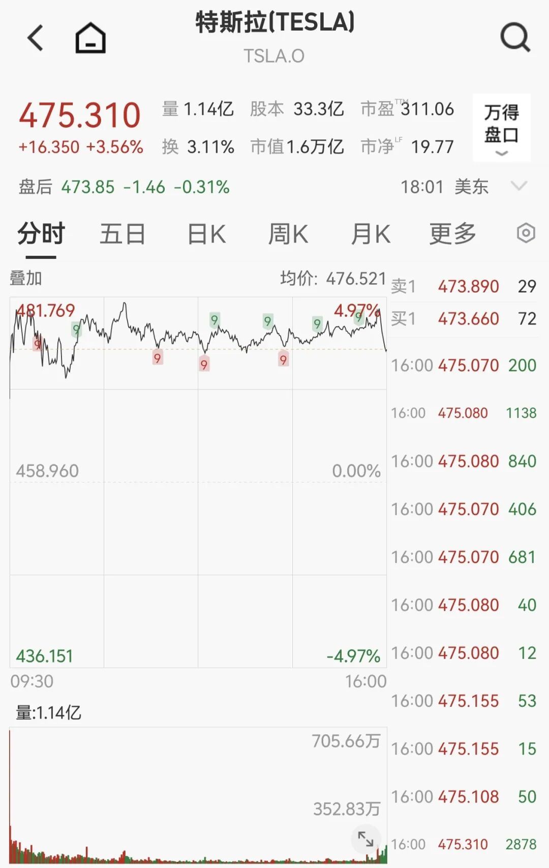 馬斯克證實特斯拉正在奧斯汀開展無人駕駛出租車測試,當(dāng)?shù)貢r間12月15日,特斯拉股價高開高走,盤中一度大漲4.97%,最終收于475.31美元,漲幅達3.56%,創(chuàng)下2025年以來的新高。目前該股價僅比2024年12月創(chuàng)下的歷史高點低約1%。