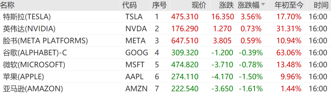 特斯拉上漲超3%,英偉達上漲0.73%,臉書上漲0.59%,其余美國科技七巨頭則均以跌勢收尾。