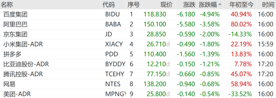 百度集團下跌4.94%,阿里巴巴下跌3.58%,京東集團下跌2.00%,在萬得中概科技龍頭指數(shù)成分股中領(lǐng)跌。