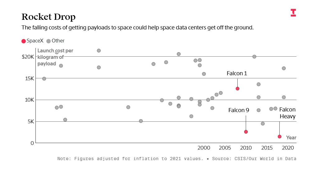 圖:送入太空的有效載荷成本持續(xù)下降,或為太空數(shù)據(jù)中心的實現(xiàn)創(chuàng)造條件
