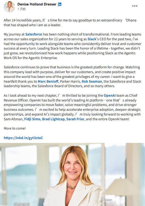 此外,考慮到奧特曼幾周前曾公開批評Slack制造“無效工作”,此次聘請其首席執(zhí)行官的行為,也引發(fā)了外界的進一步猜測:這是否暗示OpenAI有意深入了解、甚至未來可能進入AI原生的協(xié)作與通訊領域?德雷瑟在該領域的深刻見解,無疑將成為公司未來潛在戰(zhàn)略布局的寶貴資產。