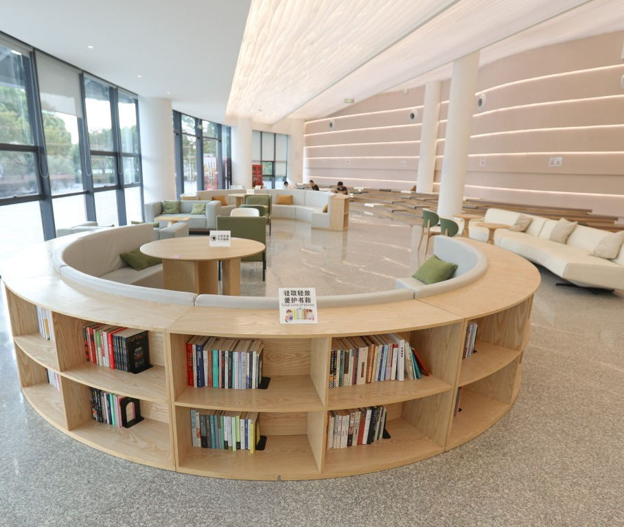 在麒麟生態(tài)公園中還有一處靜謐的驛站,層層疊疊的白色頂燈在室內(nèi)泛出漣漪般的光影,波浪形的書架、弧線形的階梯座椅,仿佛將運糧河的柔波攬入懷中。從書架上隨意取一本書,就能盡情享受閱讀時光。
