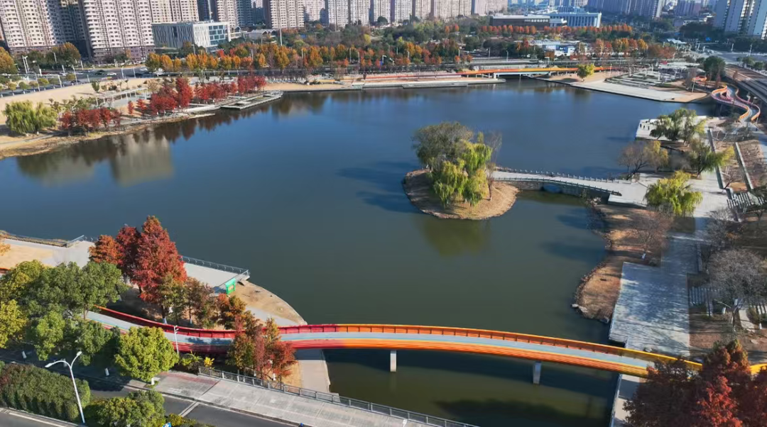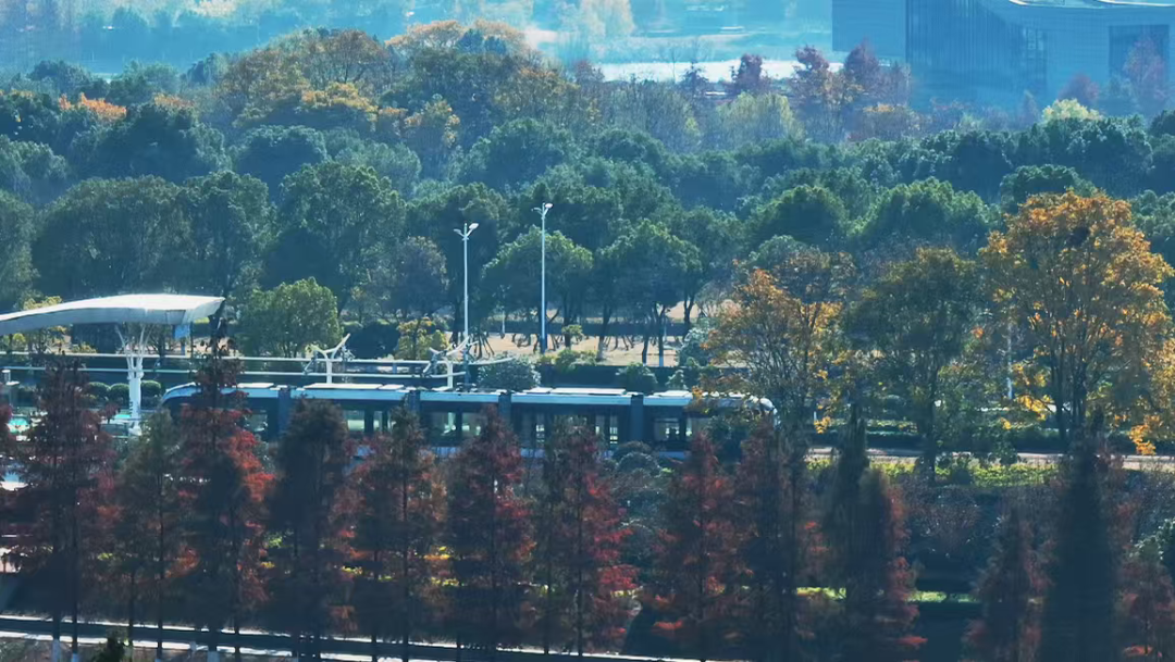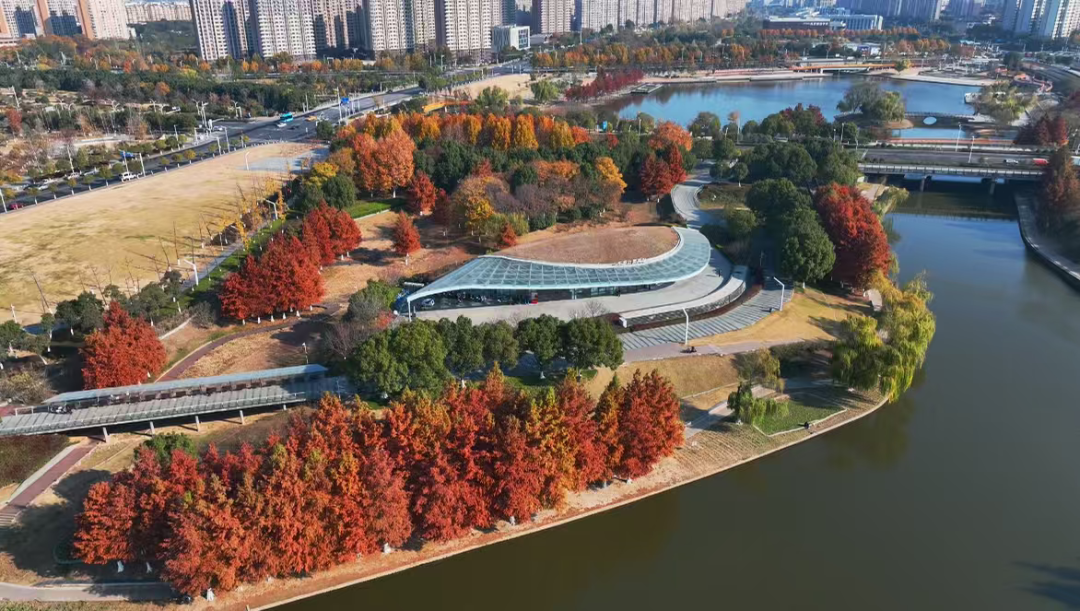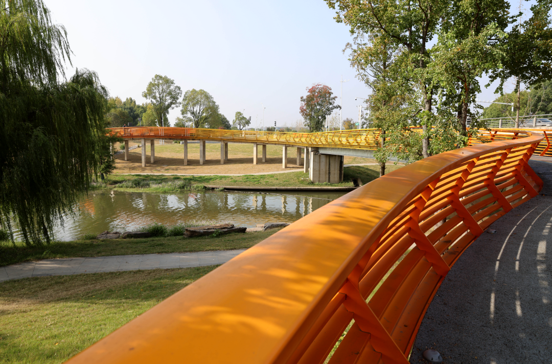 公園內(nèi)蜿蜒的步行道、簡潔的觀景臺,與秋日景色完美融合。你可能剛走過一座極具現(xiàn)代感的拱橋,轉(zhuǎn)身便踏入一片紅楓林,體現(xiàn)了麒麟科創(chuàng)園“在園區(qū)中建公園,在公園中建園區(qū)”的理念。