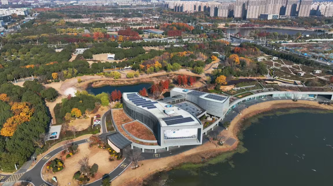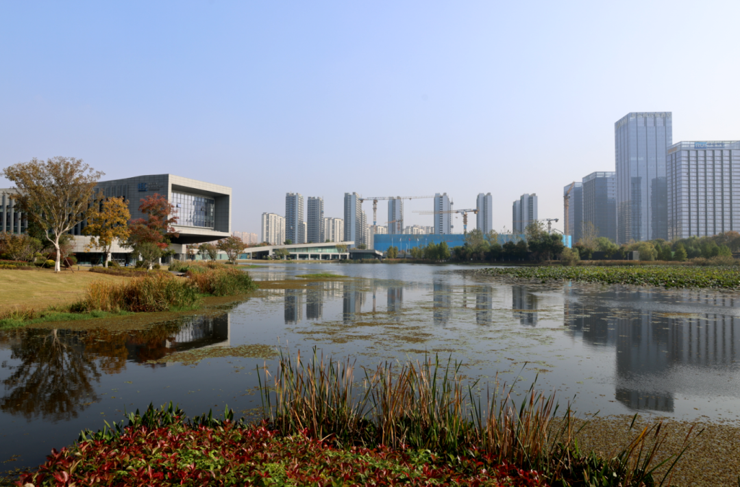 “兩水夾明鏡,雙橋落彩虹”的詩意意境,在這座現(xiàn)代公園中找到了呼應(yīng)。坐擁絕佳湖景的IEC國際標準促進中心(南京),是這幅動態(tài)自然畫卷中的點睛之筆。造型獨特的直線條建筑、玻璃幕墻的硬朗光澤,與湖邊蒲葦?shù)睦w細柔美、湖波的靈動曲線形成了剛?cè)岵拿烂顚Ρ取?/p>