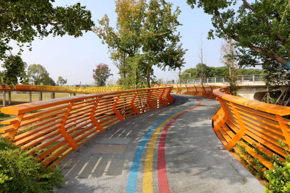 三河公園采用立體設(shè)計,分為上下兩層。上層是棧橋,如高懸空中的彩虹般繞湖一圈;下層緊靠湖水,設(shè)有休閑座椅,能更好地欣賞水面的粼粼波光。