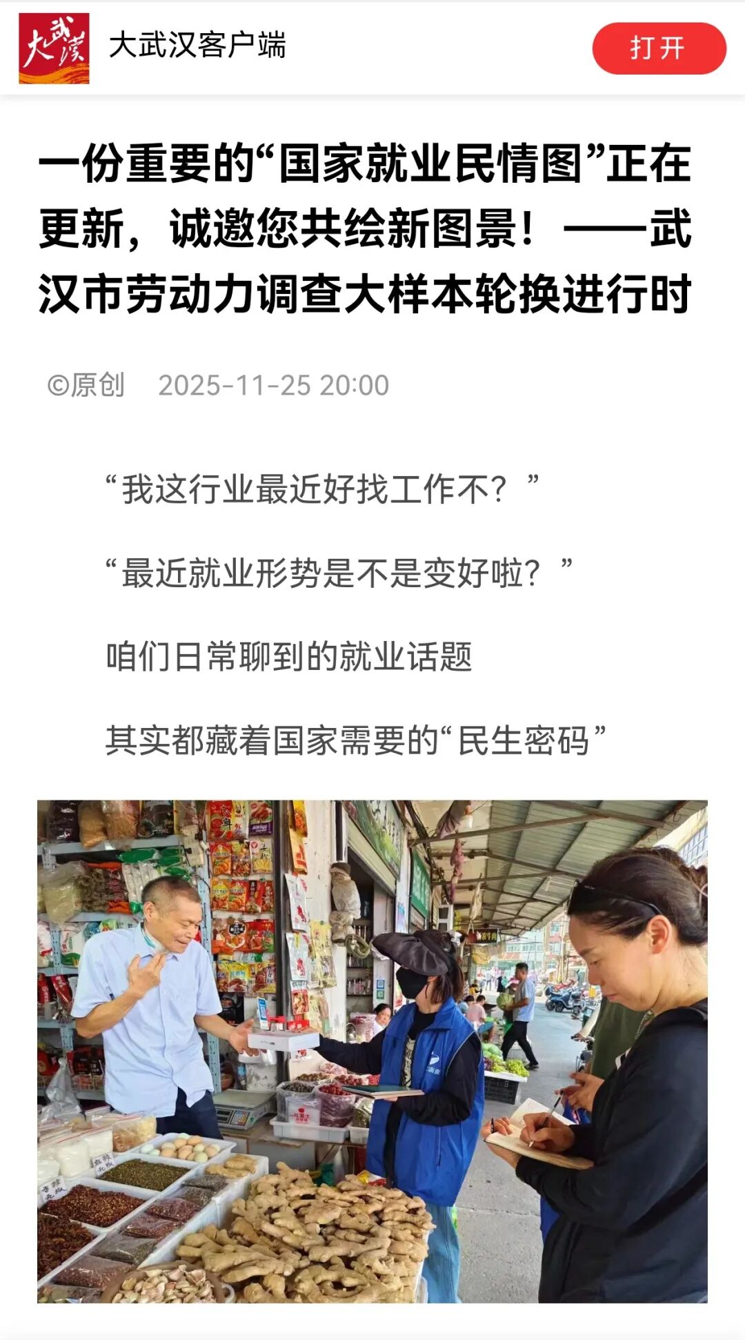 搭建線上+線下、系統(tǒng)內(nèi)+系統(tǒng)外的立體宣傳網(wǎng)絡(luò),通過系統(tǒng)內(nèi)微信公眾號、在漢主流媒體發(fā)布政策解讀與工作動態(tài)。如11月25日在長江日報大武漢客戶端發(fā)布《一份重要的“國家就業(yè)民情圖”正在更新 誠邀您共繪新圖景》,向公眾闡明大樣本輪換的重要性與必要性。